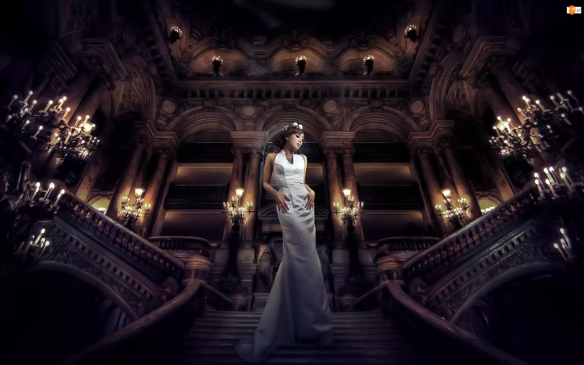 Kobieta, Biała Suknia, Opera, Schody