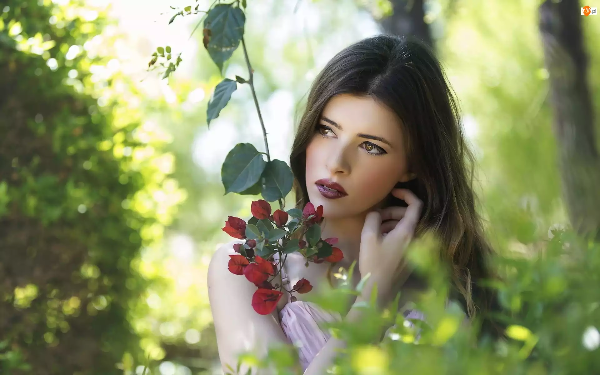 Kobieta, Gałązka, Makijaż, Kwitnąca