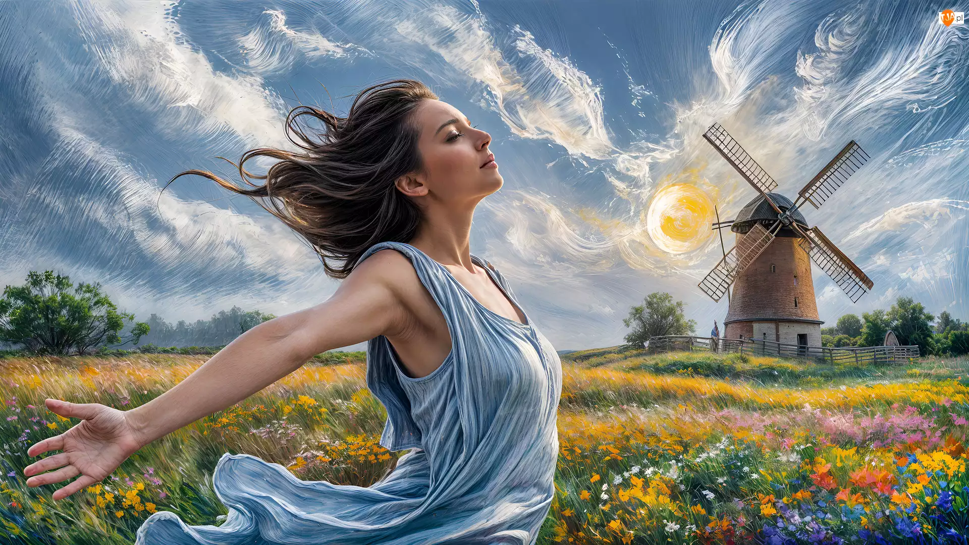 Kobieta i młyn na ukwieconej łące