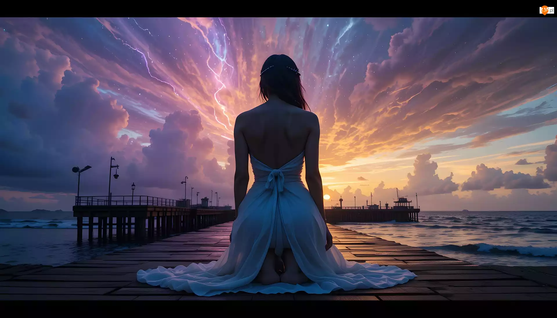 Zachód, Morze, Słońca, Grafika, Sukienka, Komputerowa, Fantasy Fantasy, Dziewczyna, Molo, Niebo, Osoba, Biała, Chmury, Nabrzeże, Siedząca, Krajobraz