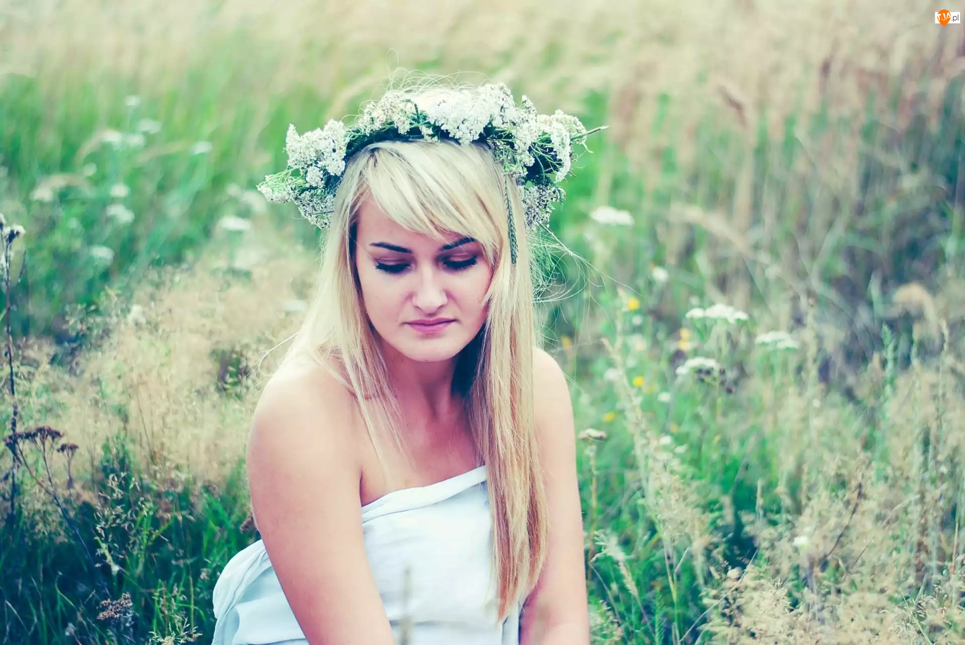 Kobieta, Łąka, Blondynka, Wianek