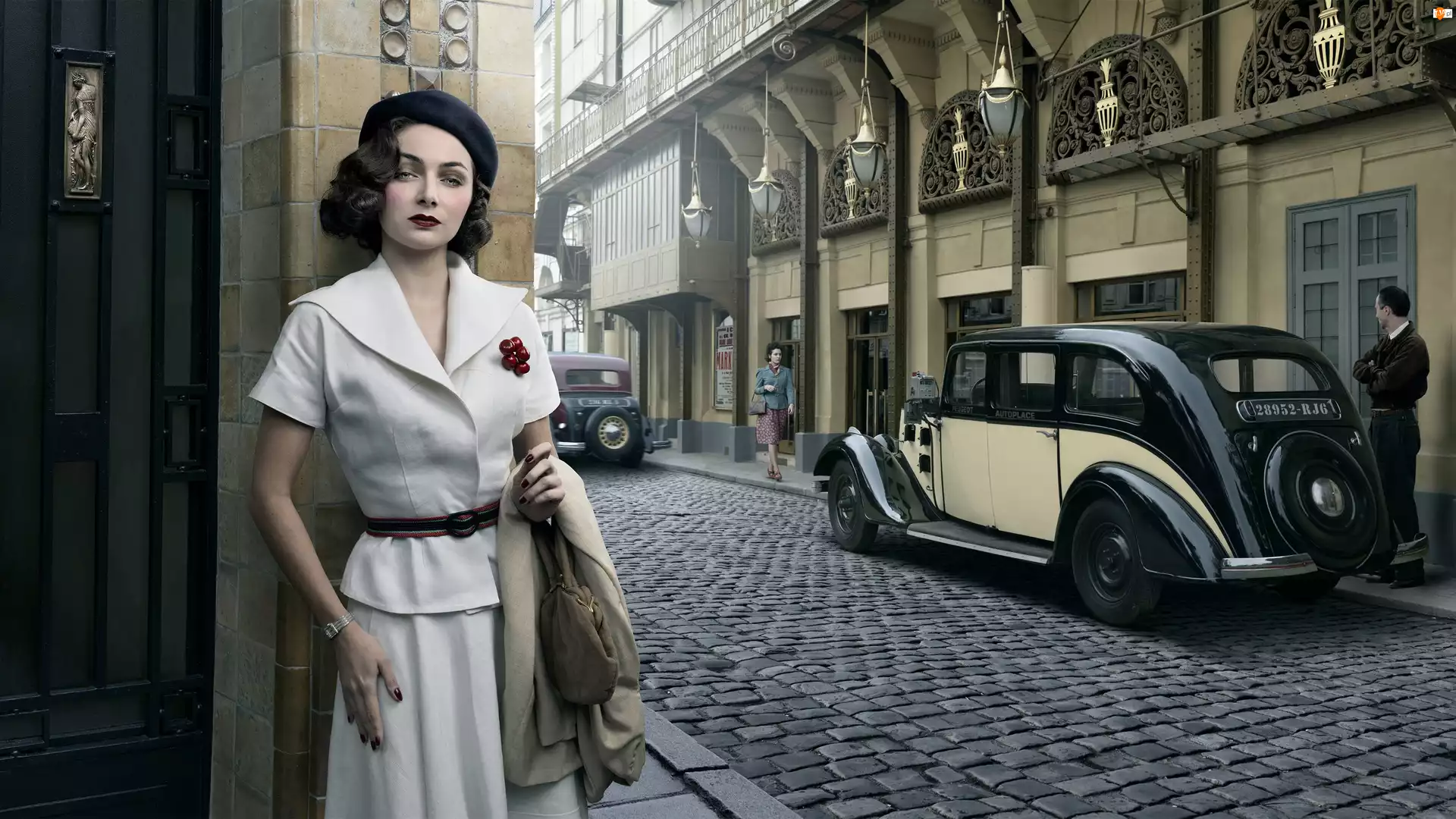 Beret, Retro, Domy, Kobieta, Ulica, Samochód, Zabytkowy