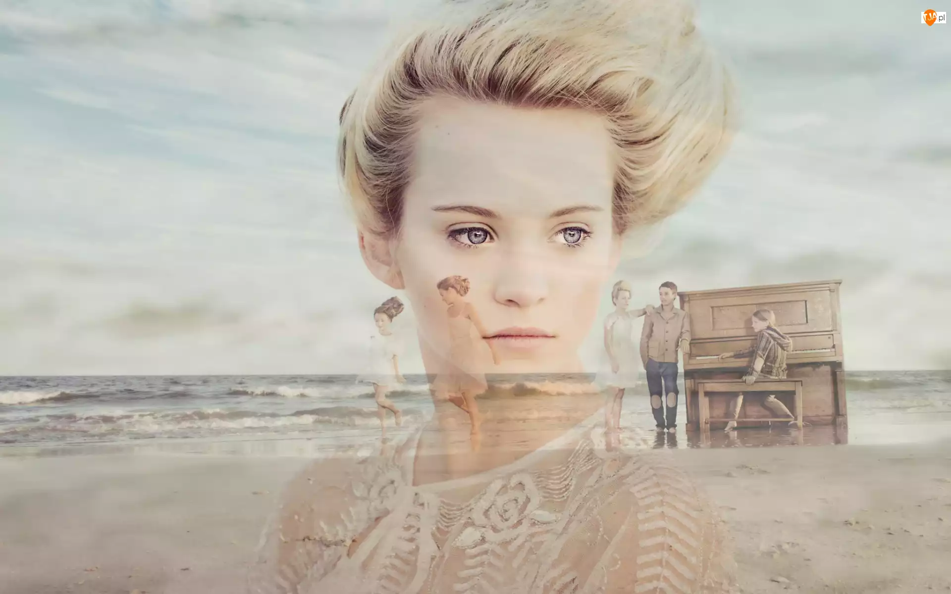 Morze, Kobieta, Pianino, Fale, Spojrzenie, Rodzina, Plaża, Wspomnienia