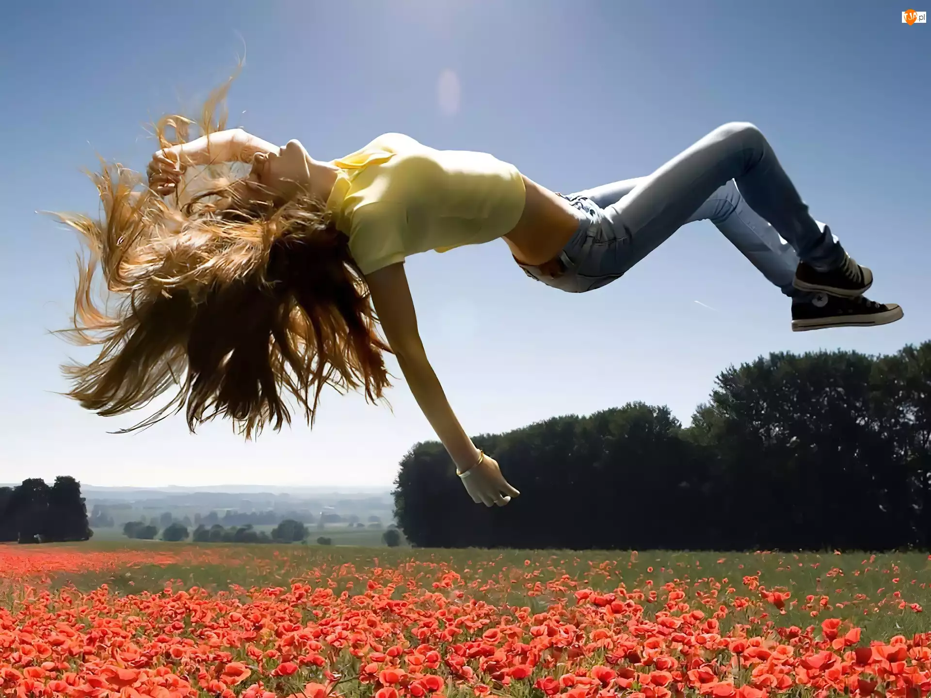 Kobieta, Skok, Łąka, Radość, Kwiaty