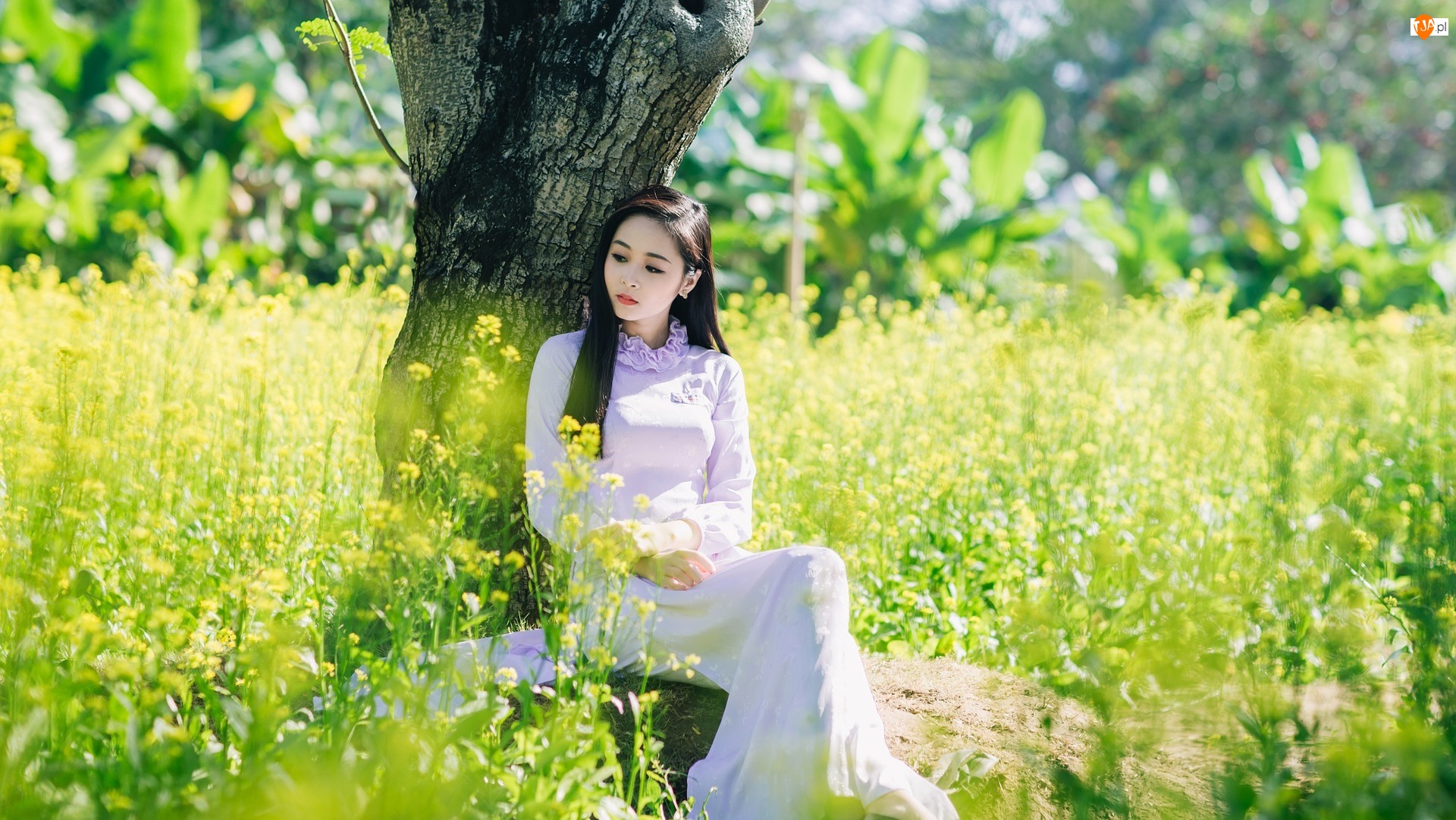 Kobieta w białej sukience siedzi pod drzewem poś