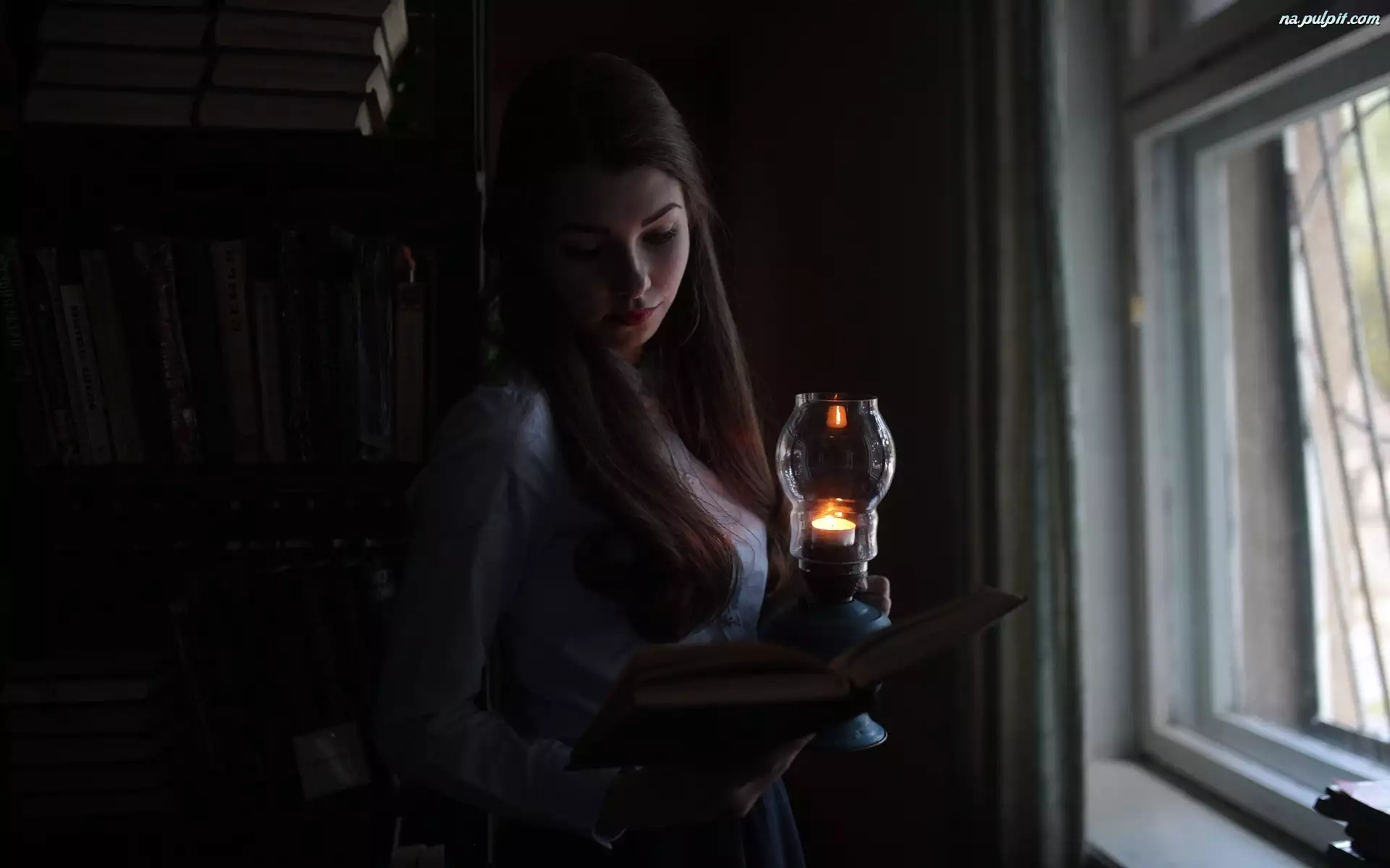 Okno, Kobieta, Lampa, Książka