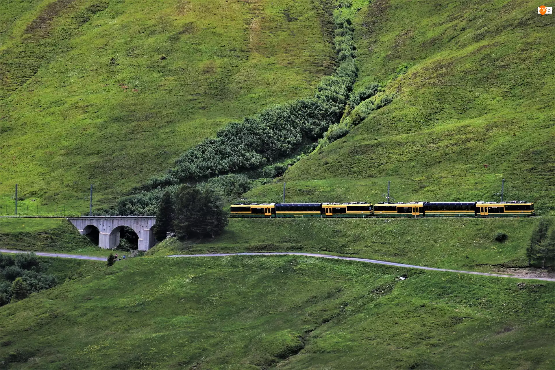 Drzewa, Góry, Most, Pociąg, Zbocze