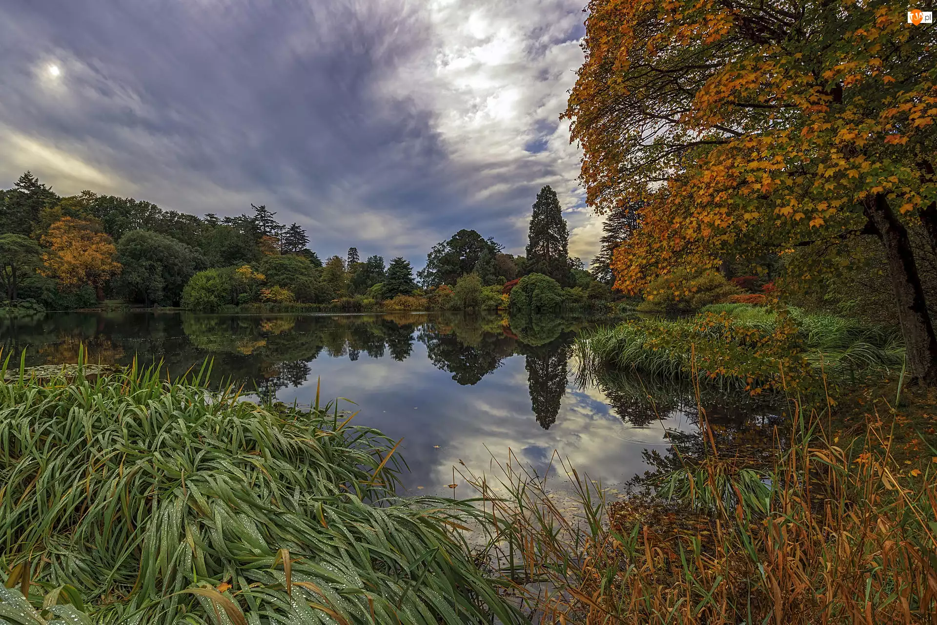 Trawa, Jezioro, Drzewa, Jesień, Szuwary, Chmury