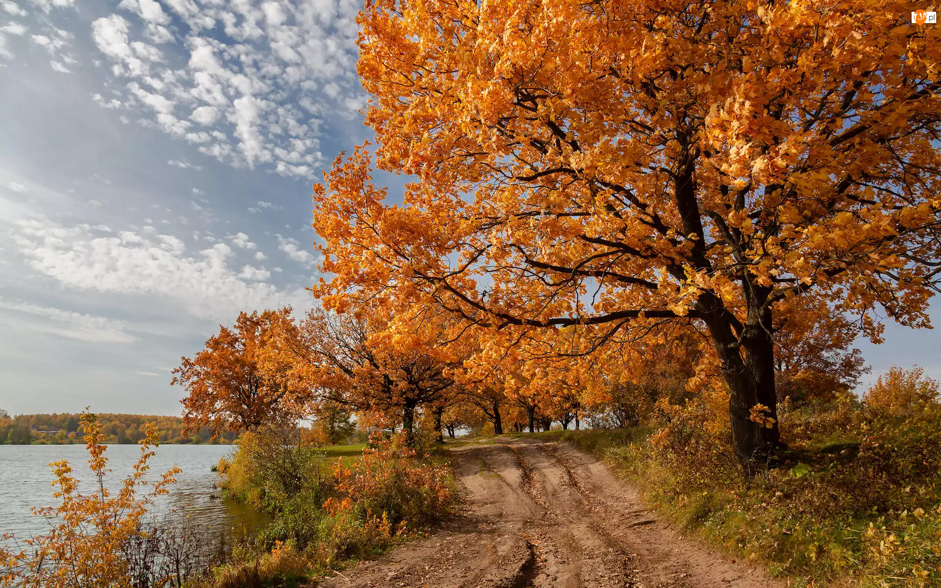 Drzewa, Droga, Trawa, Jesień, Jezioro, Lasy
