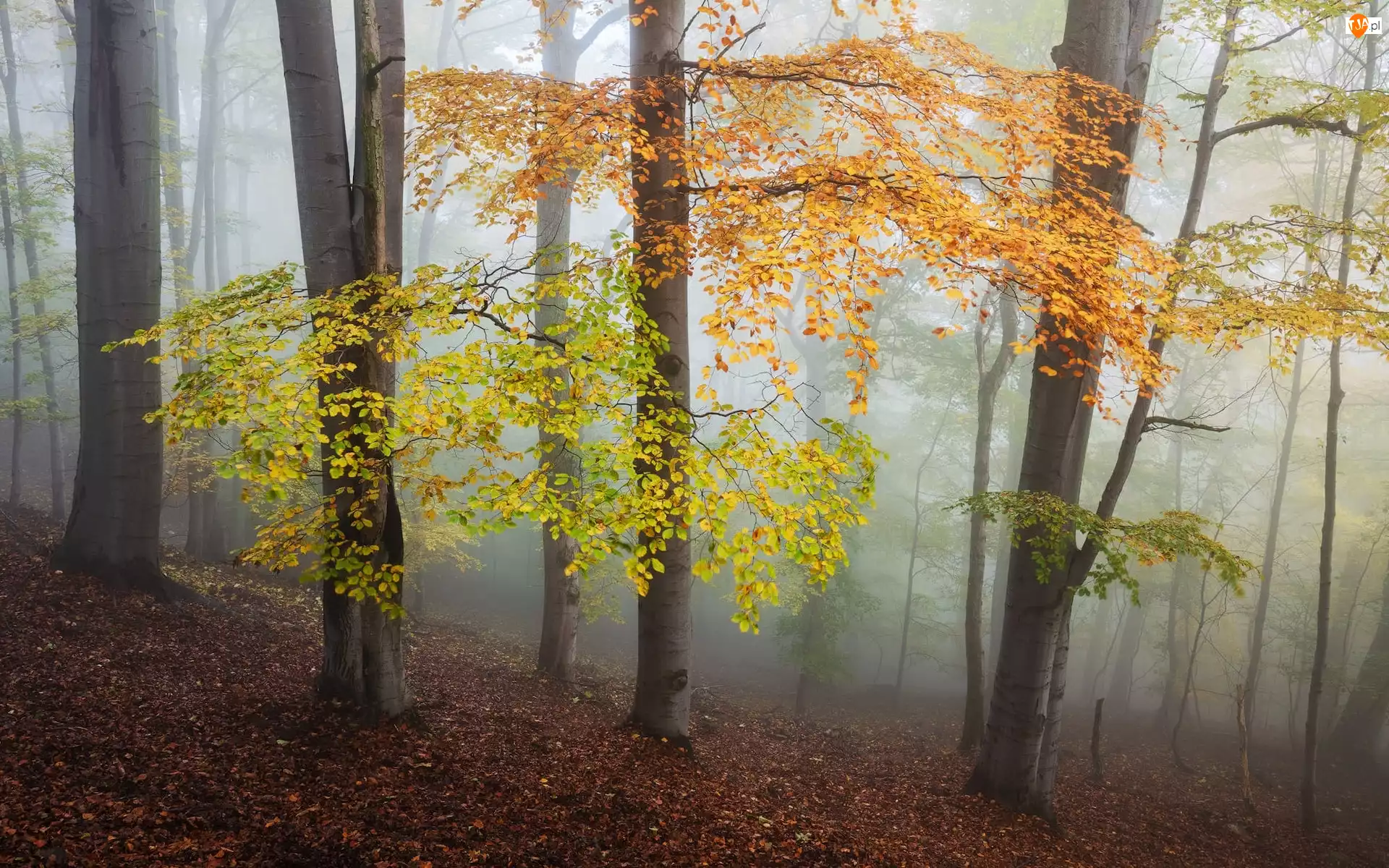 Kolorowe liście w zamglonym lesie