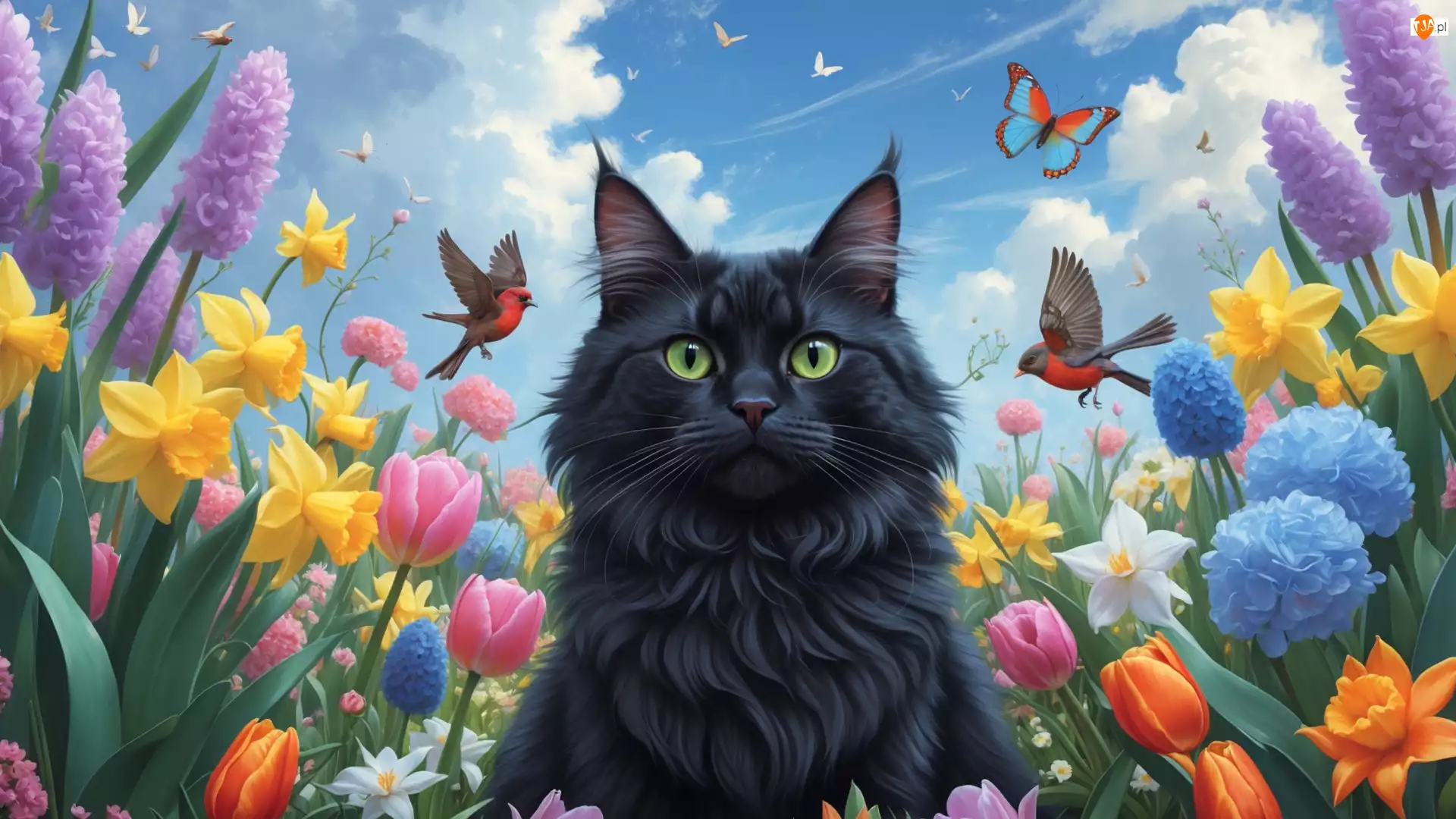 Kolorowe, Ptaki, Kot, Czarny, Kwiaty