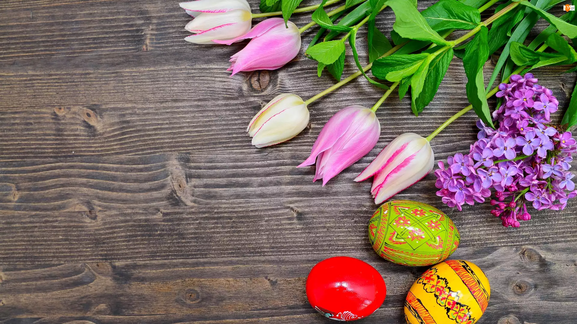 Pisanki, Drewno, Bez, Tulipany, Wielkanoc