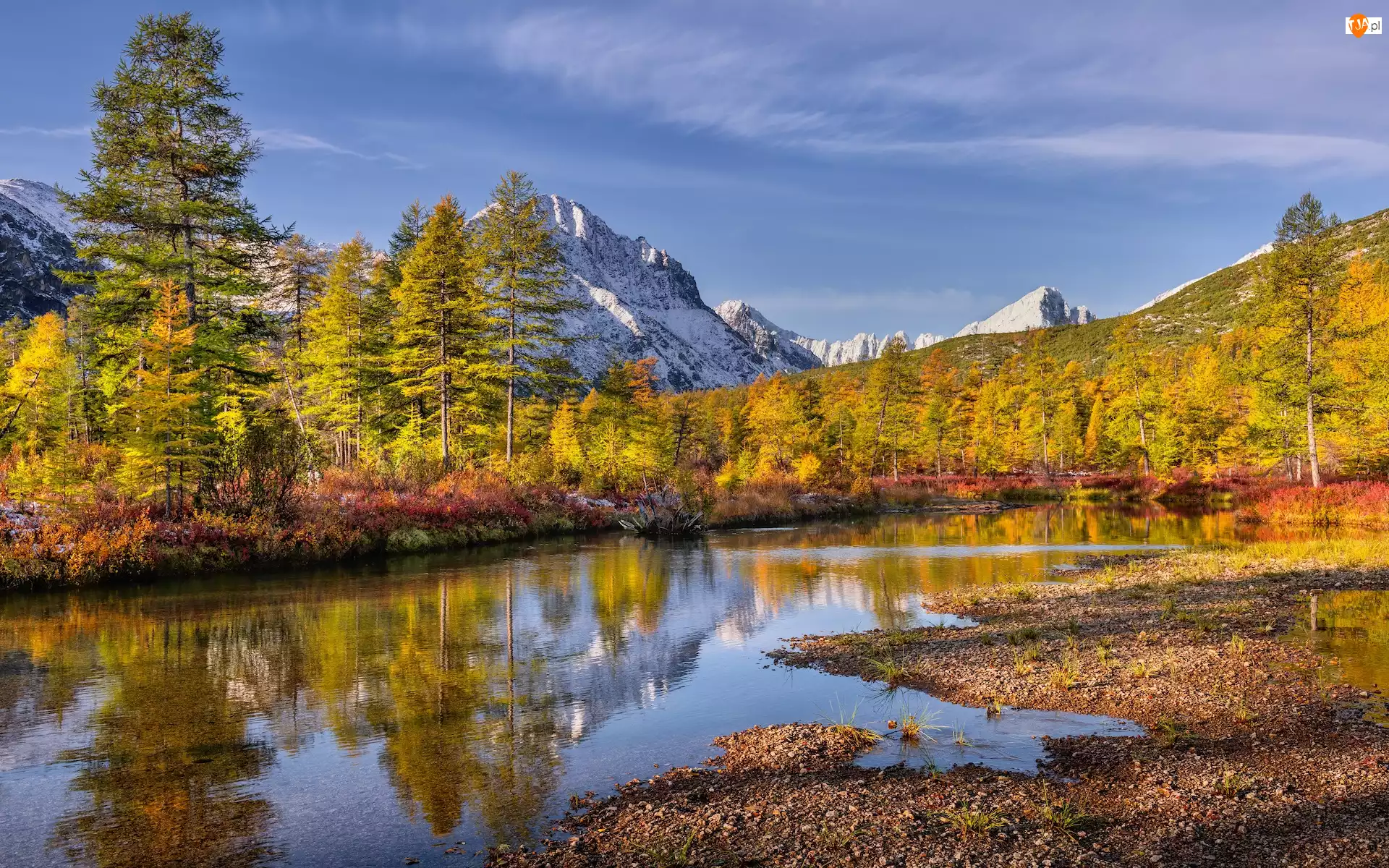 Kołyma, Góry Kołymskie, Roślinność, Rosja, Drzewa, Jesień, Jezioro