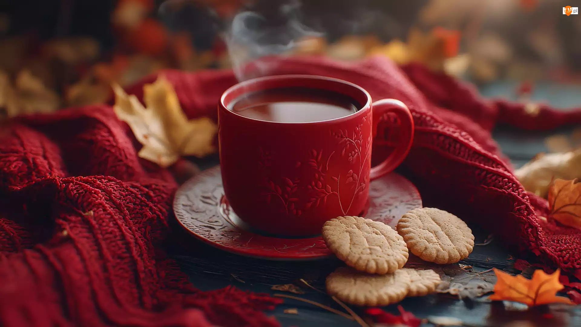 Kompozycja, Czerwony, Szal, Ciastka, Filiżanka, Czerwona, Herbata, Gorąca, Kawa, Liście