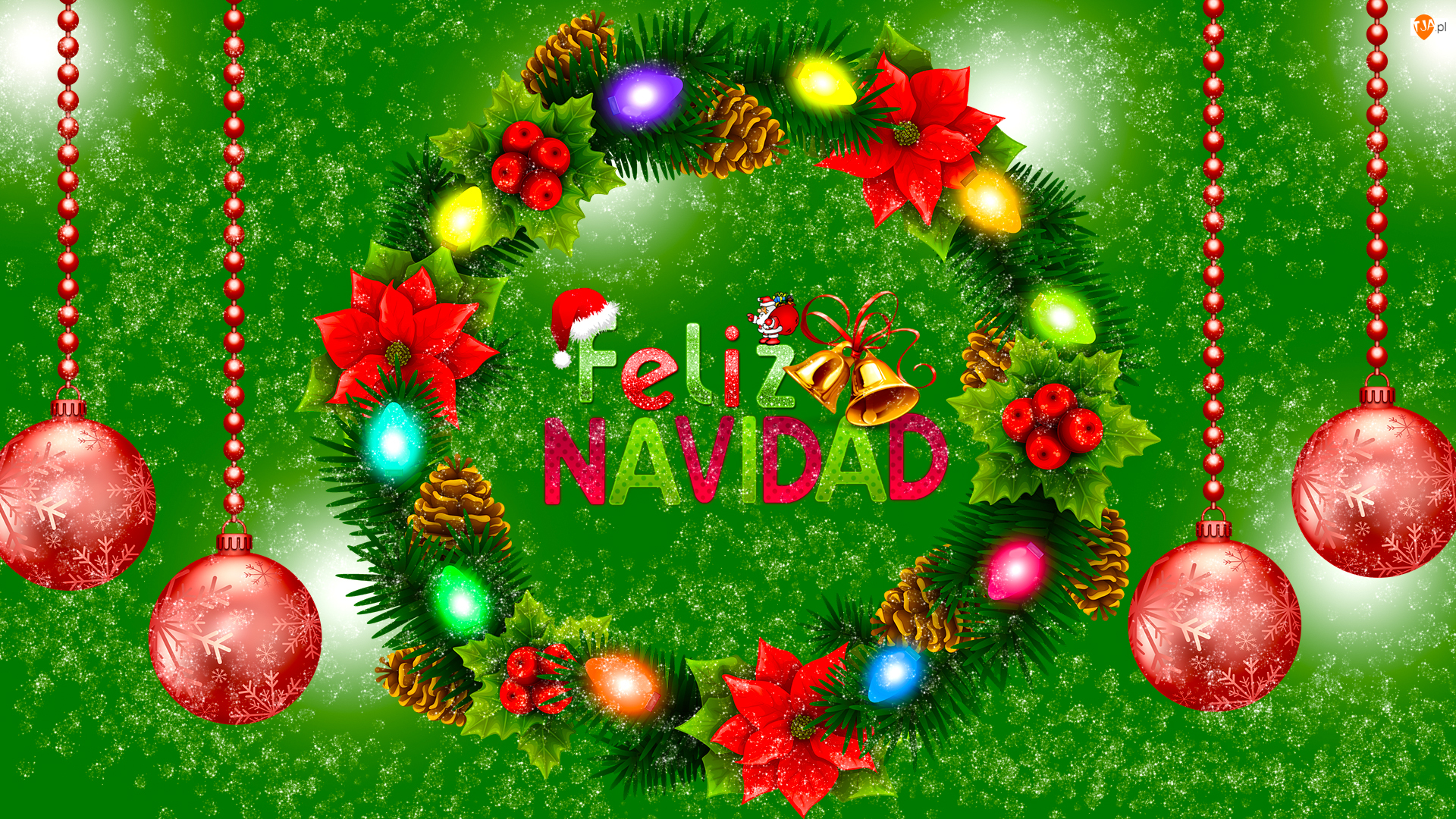 Napis, Bombki, Światełka, Życzenia, Wieniec, Grafika, Feliz Navidad, Kwiaty