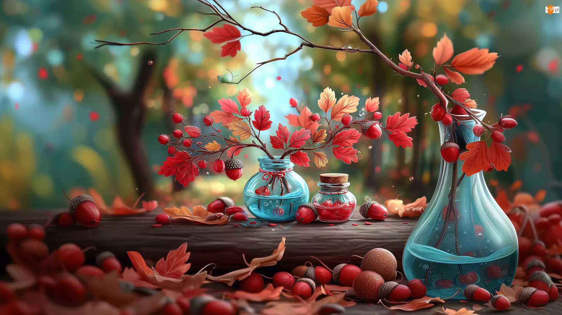 Kompozycja, Jesienna, Liście, Grafika AI, Czerwone, Wazony