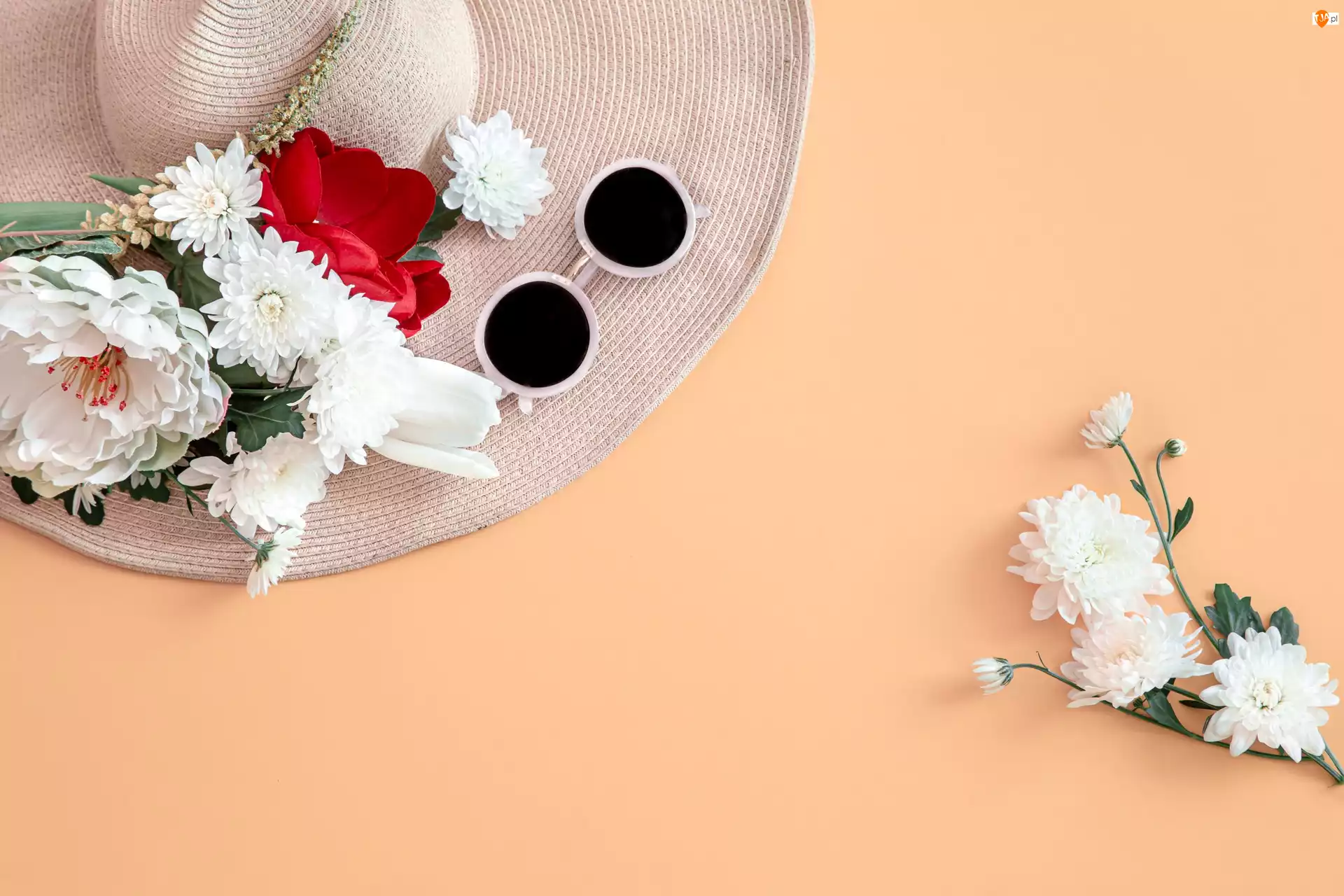 Kompozycja, Kwiaty, Kapelusz, Okulary