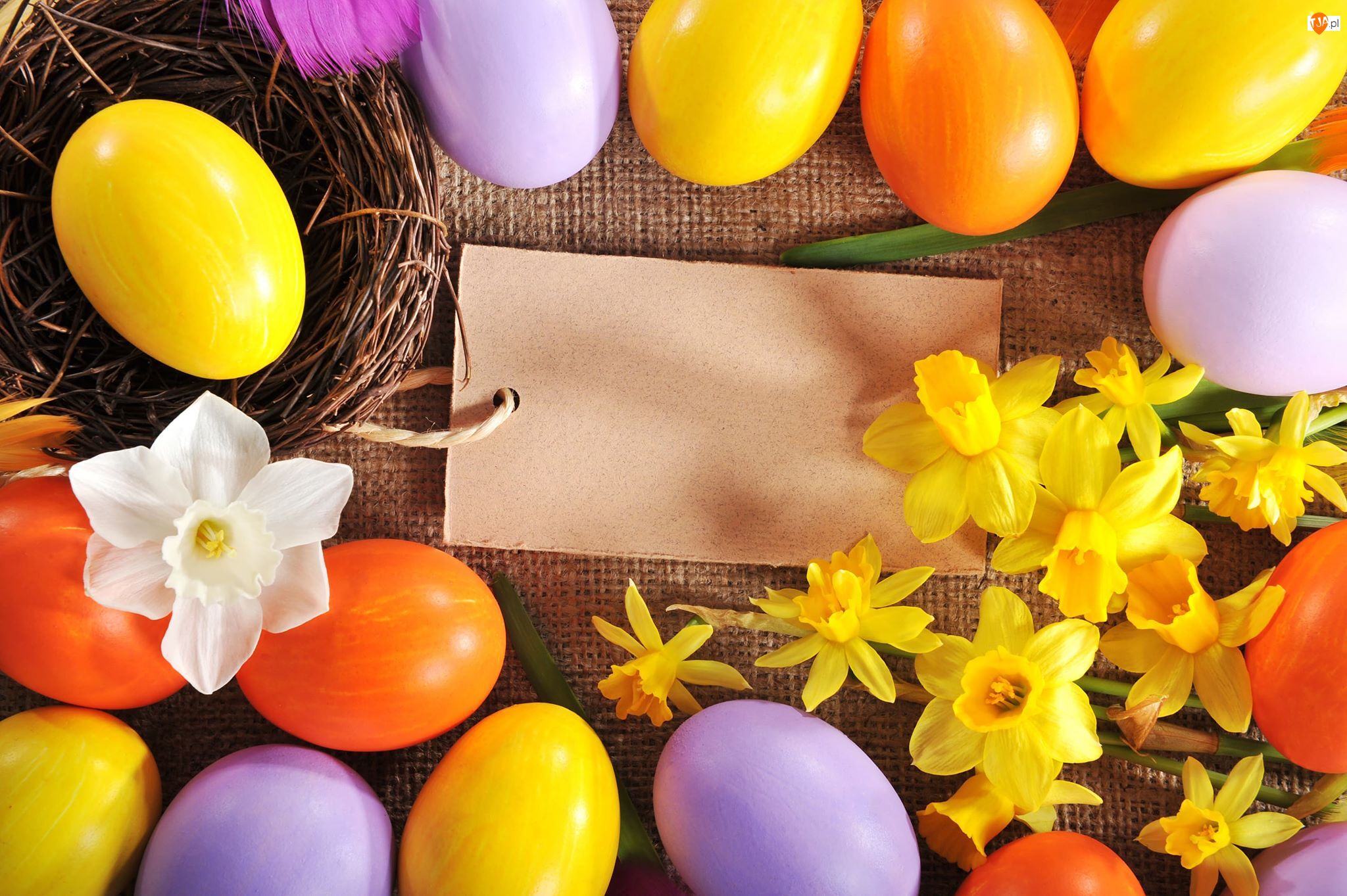 Gniazdo, Karteczka, Pisanki, Wielkanoc, Żonkile
