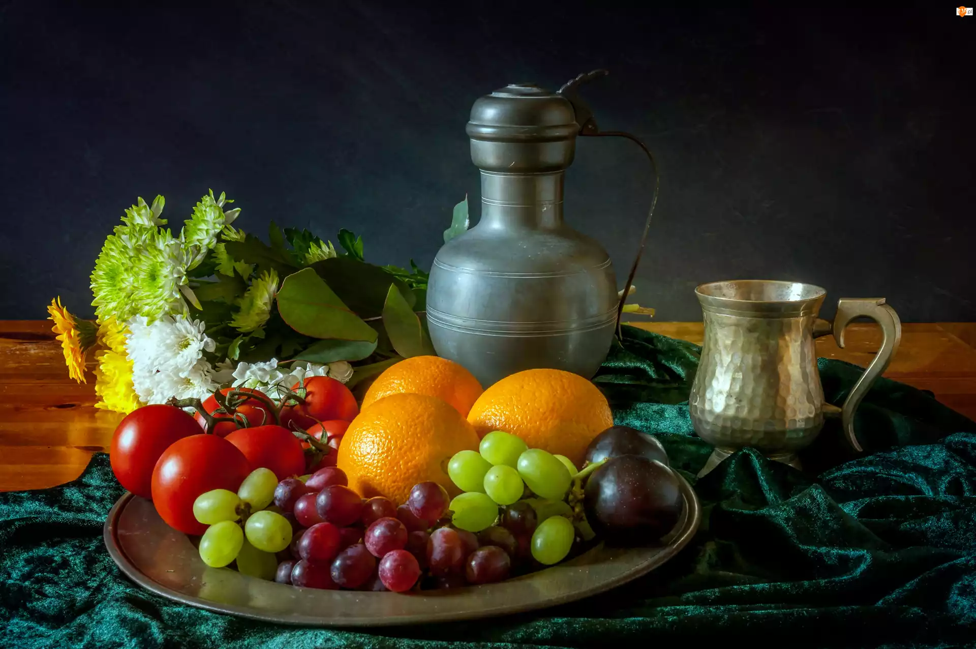 Kompozycja, Pomarańcze, Winogrona, Dzbanek