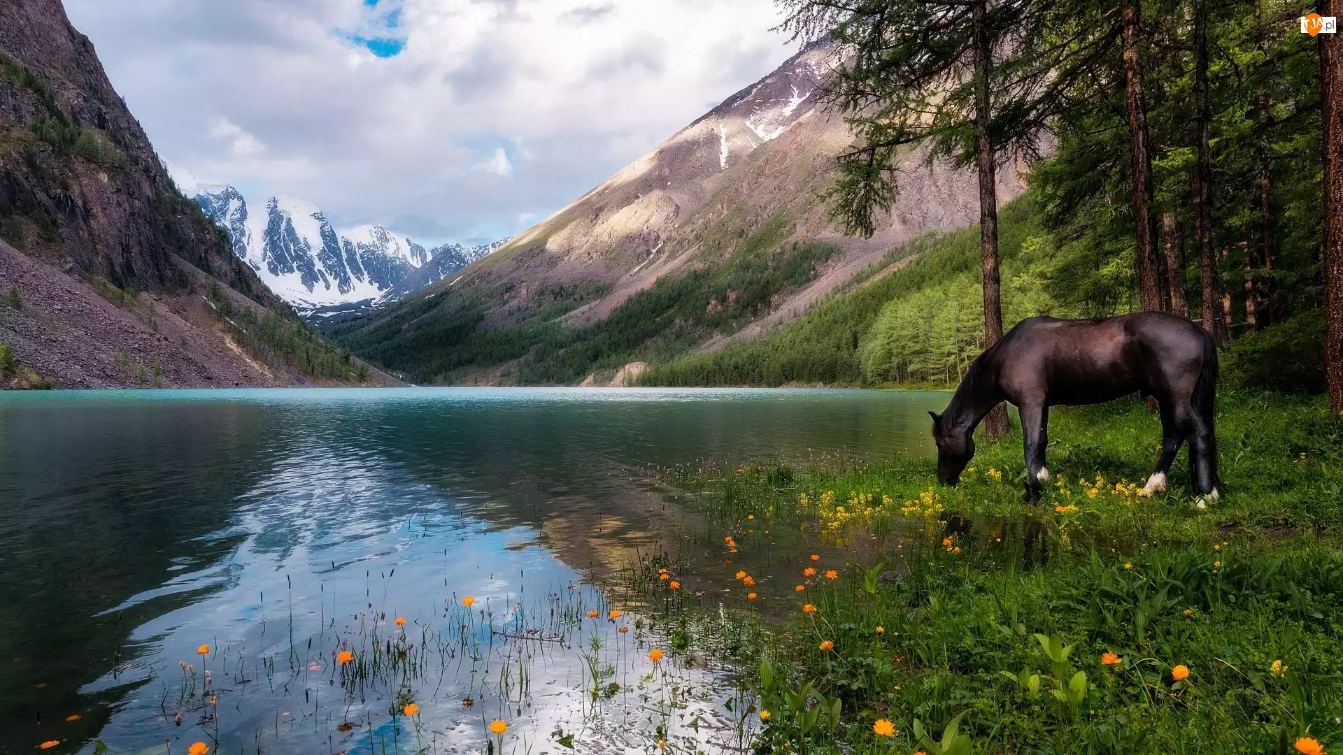 Koń, Drzewa, Jezioro, Góry, Kwiaty