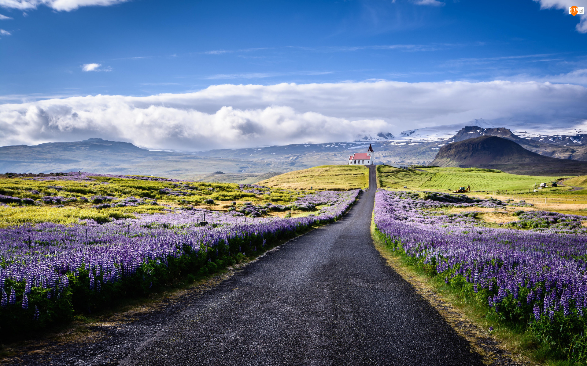 Kościół, Droga, Łubin, Półwysep Snaefellsnes, Chmury, Góry, Islandia, Kwiaty