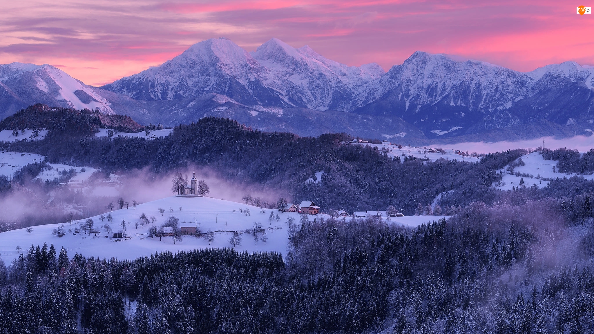 Poranek, Słowenia, Kościół św Tomasza, Lasy, Skofja Loka, Zima, Mgła, Góry