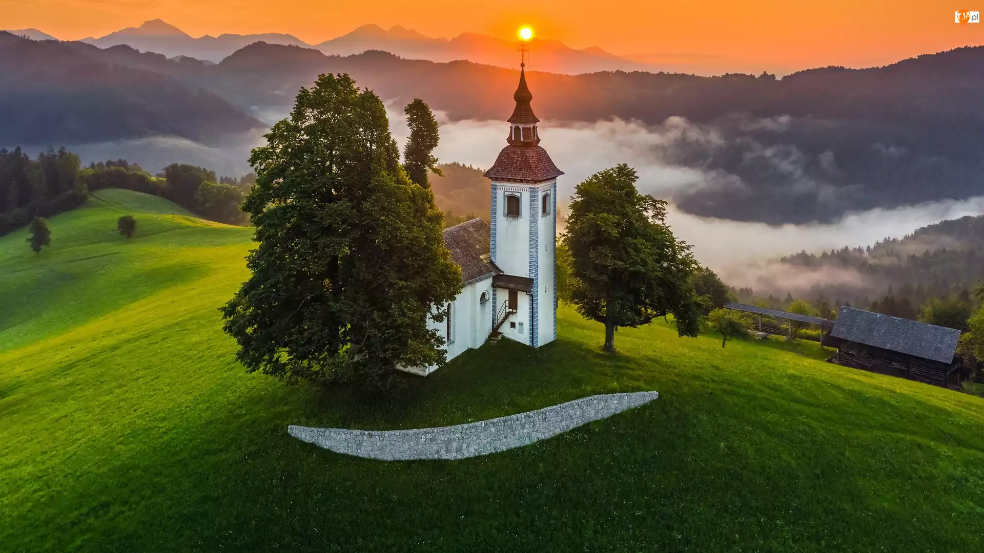Mgła, Drzewa, Słońce, Alpy Julijskie, Gmina Skofja Loka, Słowenia, Kościół św Tomasza, Wieś Krivo Brdo, Góry, Wzgórze