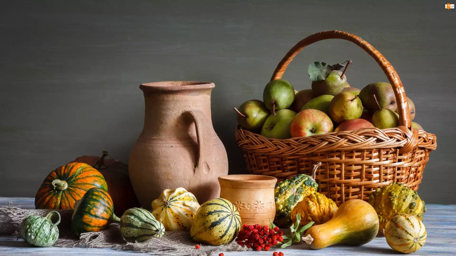 Dynie, Gruszki, Kamionki, Kompozycja, Dzban, Koszyk, Jabłka