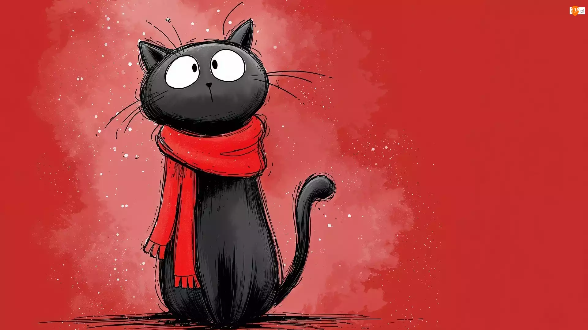 Kot, Czarny, Szalik, Grafika, Czerwony, Tło