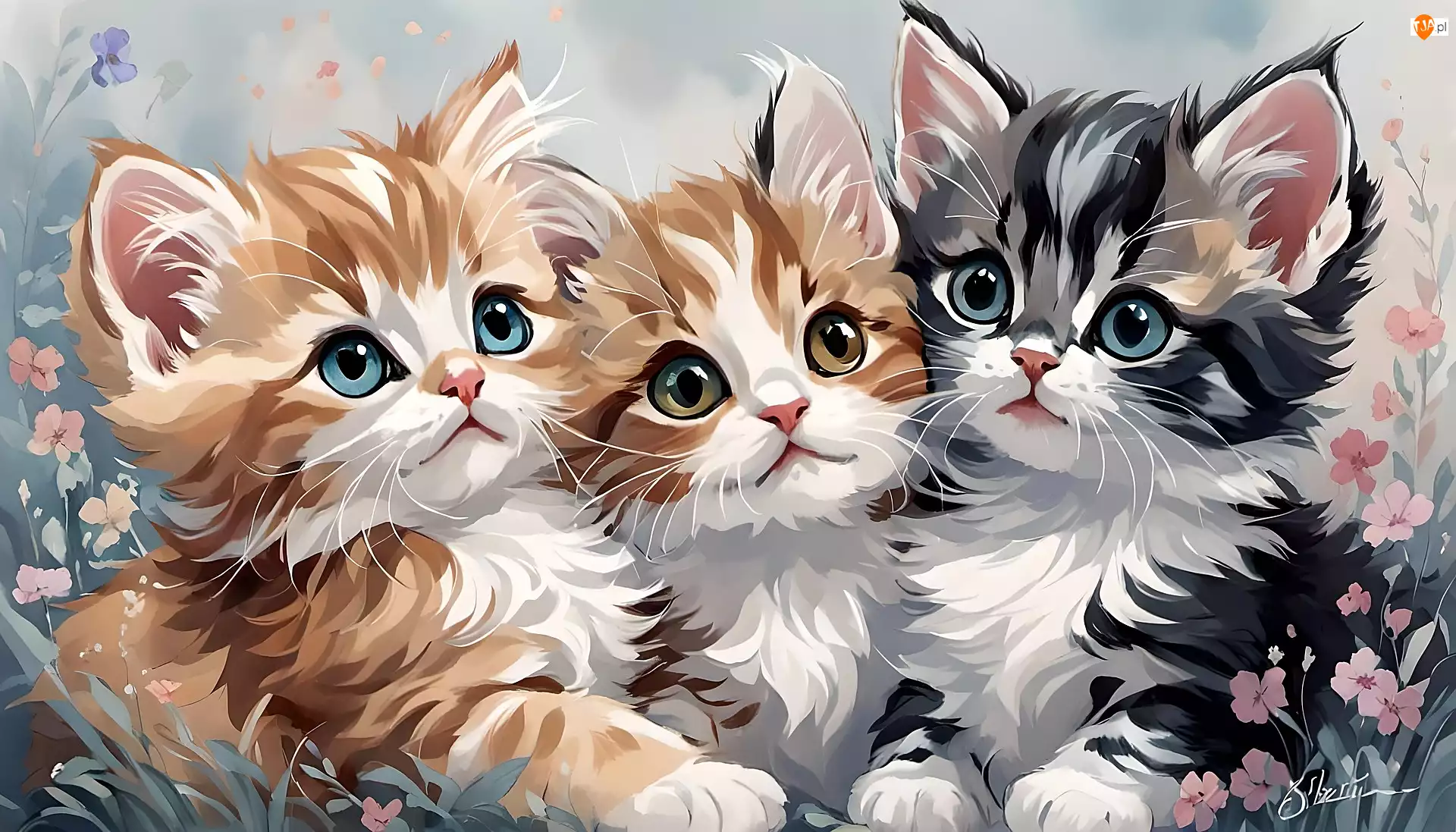 Koty, Kwiaty, Trzy, Grafika, Różowe