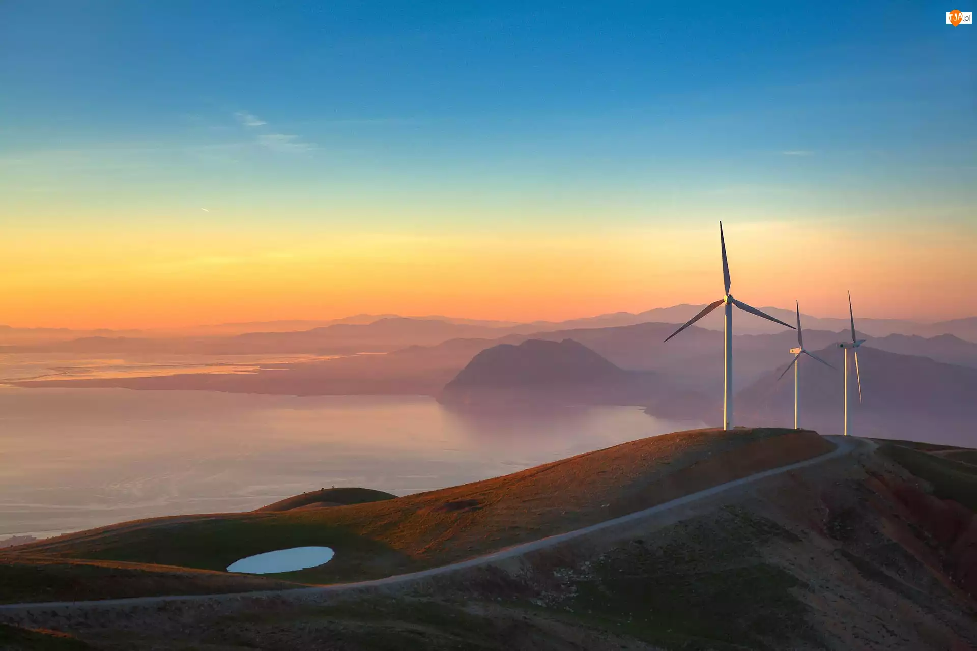 Krajobraz, Woda, Wzgórze, Wiatraki