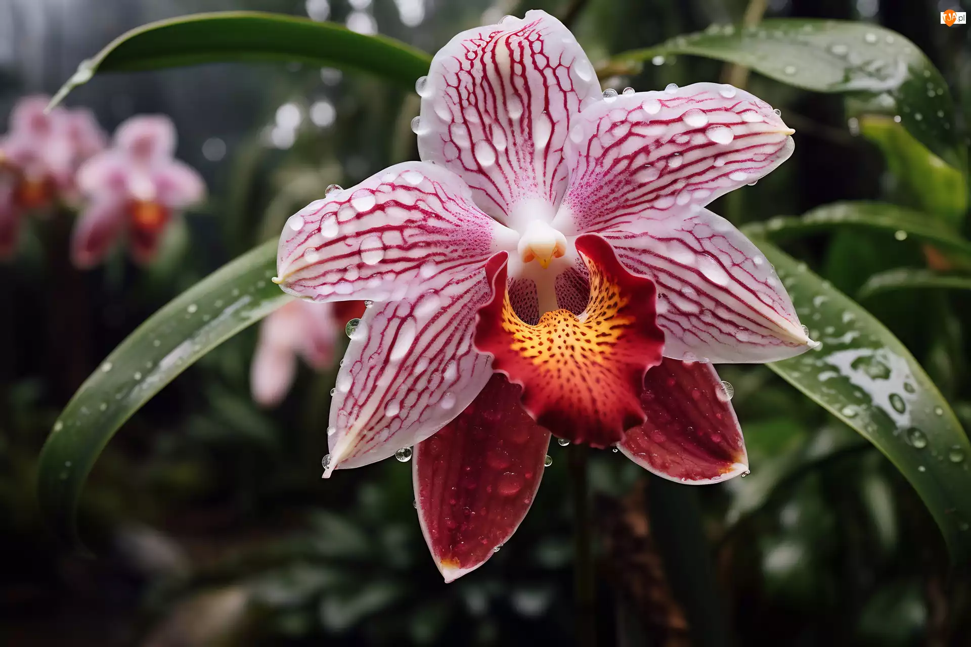 Krople, Grafika, Kwiat, Storczyk, Liście