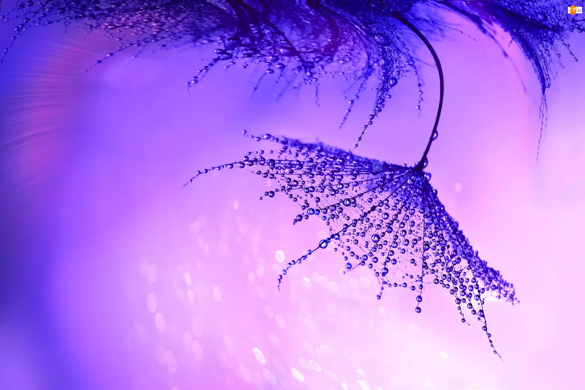 Dmuchawiec, Niebiesko-fioletowe tło, Niełupek, Makro, Krople