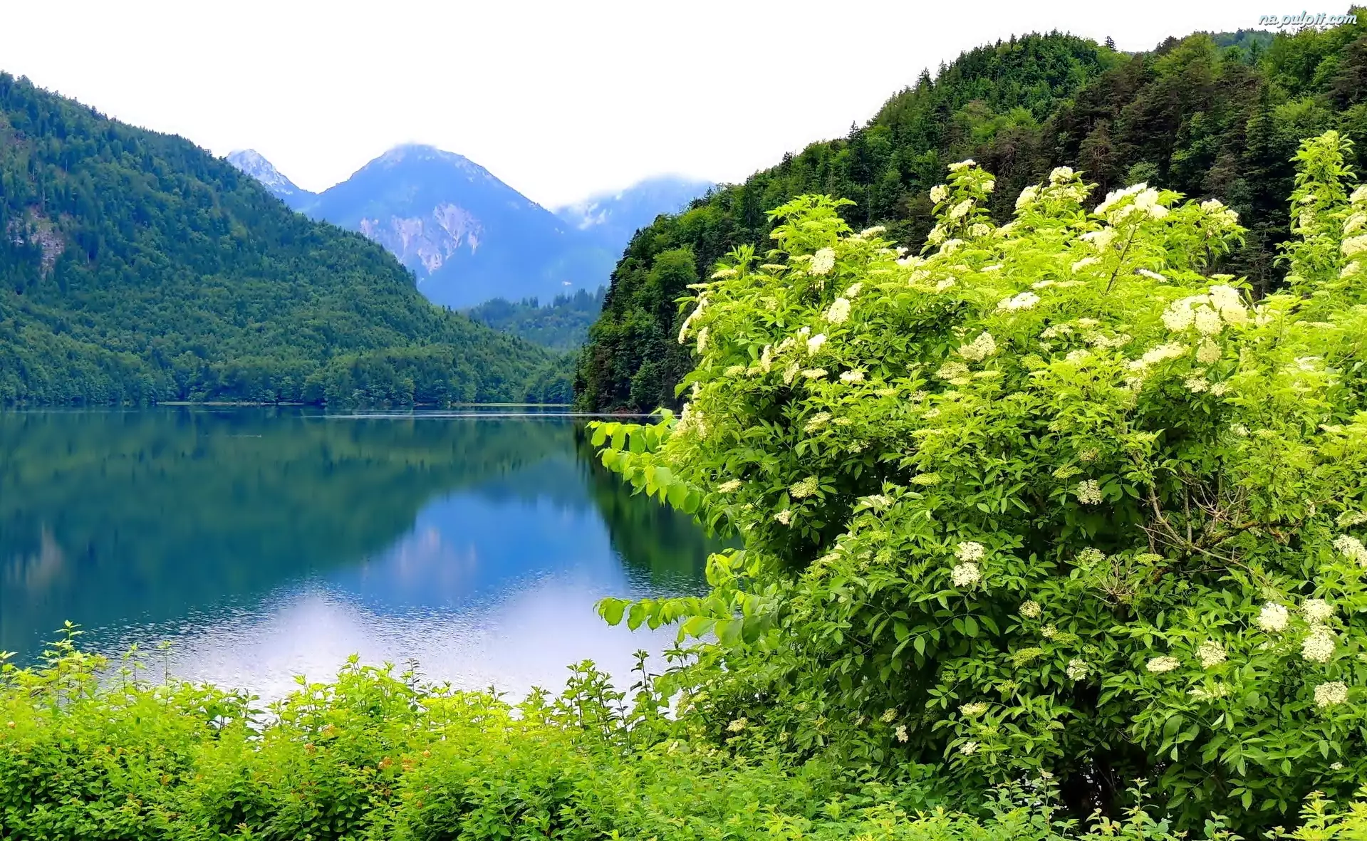Jezioro, Krzew, Las, Góry, Kwitnący