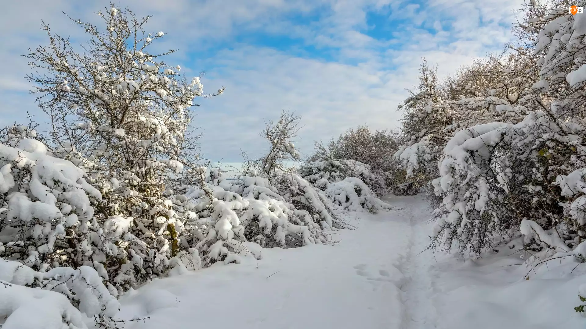 Krzewy, Ślady, Ośnieżone, Zima, Drzewa