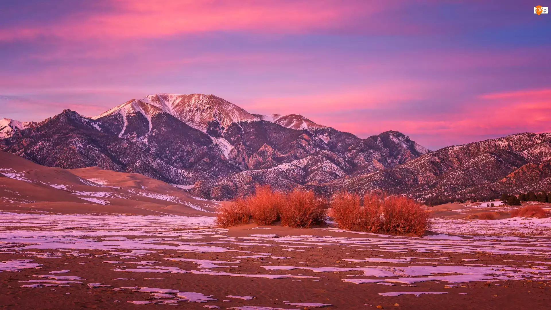 Krzewy, Zachód słońca, Skały, Góry, Niebo