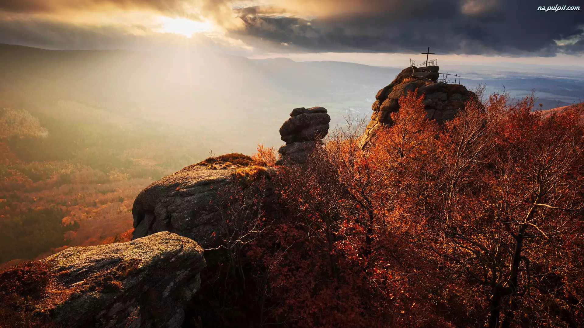 Zachód słońca, Góry Izerskie, Krzyż, Mgła, Jesień, Drzewa, Czechy, Skały
