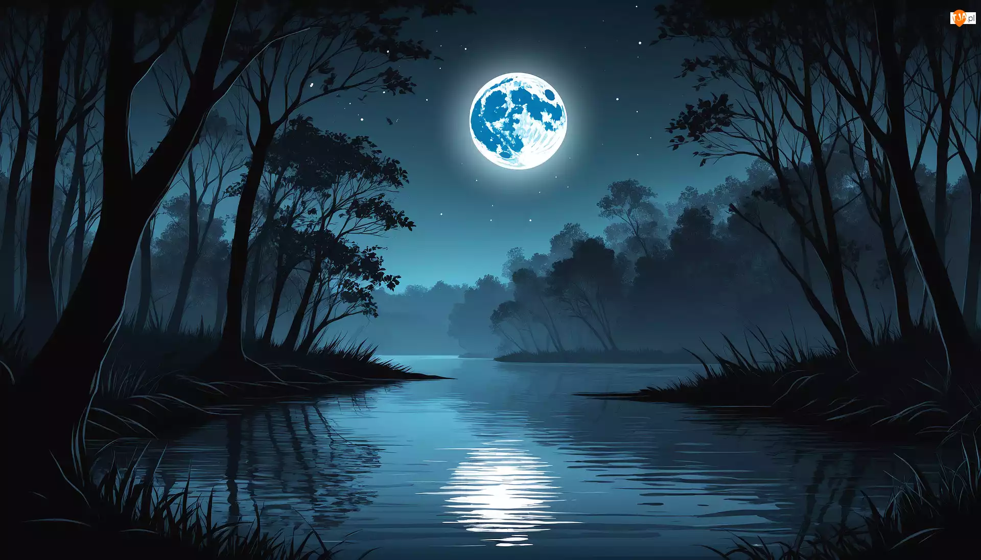 Drzewa, Grafika, Rzeka, Noc, Księżyc