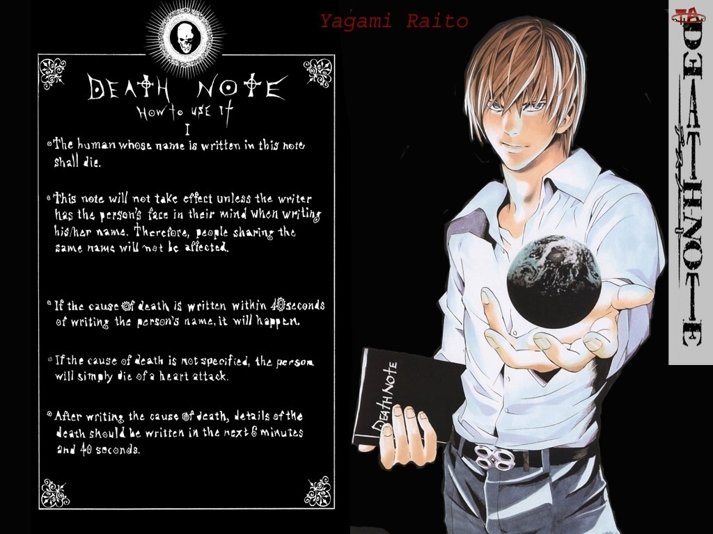 czaszka, Death Note, kula, kartka, chłopak, książka, napisy, pasek