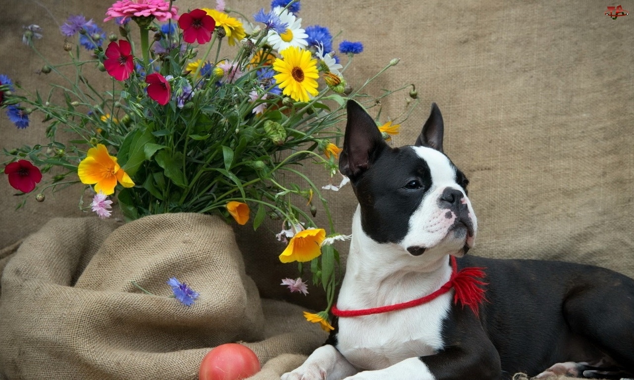 Kwiatów, Czarno, Piesek, Biały, Bukiet