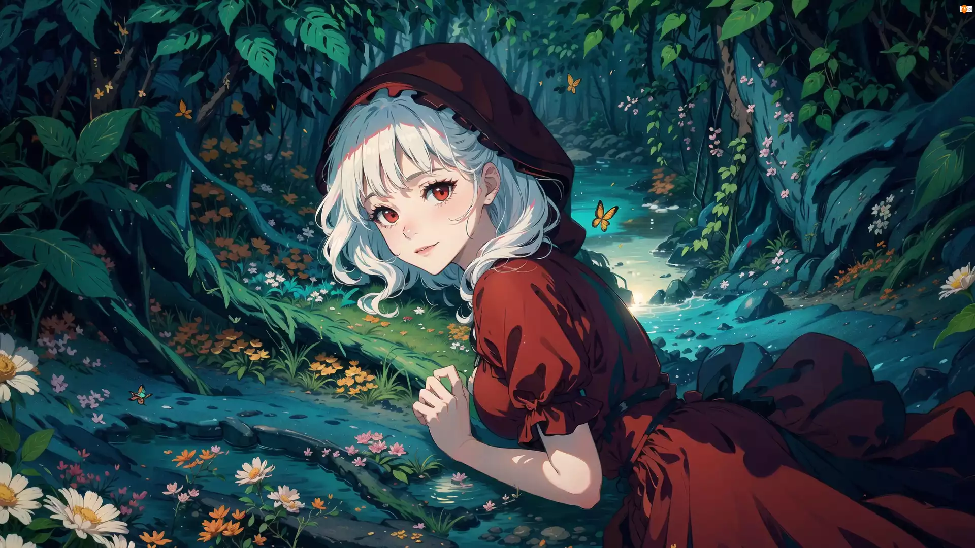 Kwiaty, Anime, Sukienka, Dziewczyna, Motyle