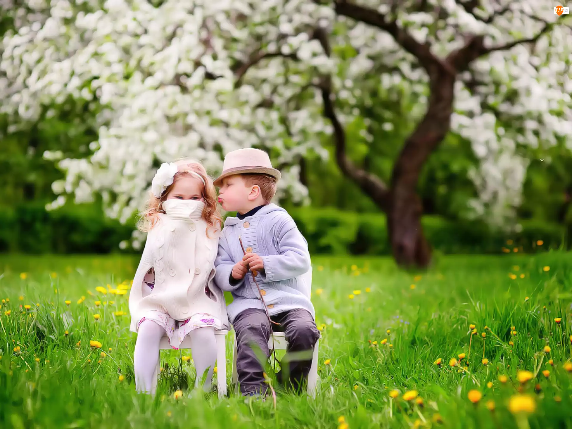 Kwiaty, Chłopak, Sad, Dziewczynka, Trawa