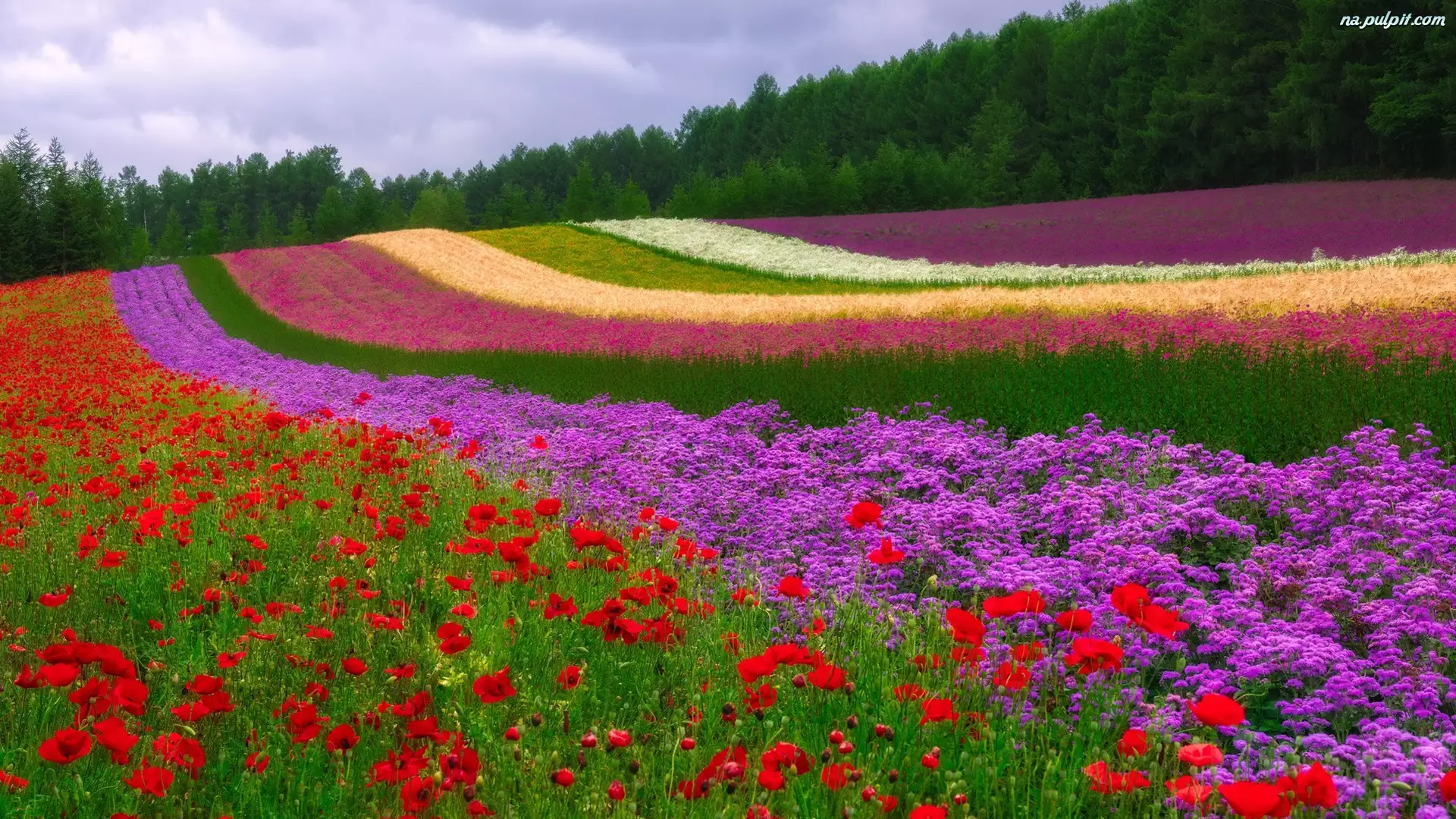 Kwiaty, Drzewa, Kolorowe, Pole, Las
