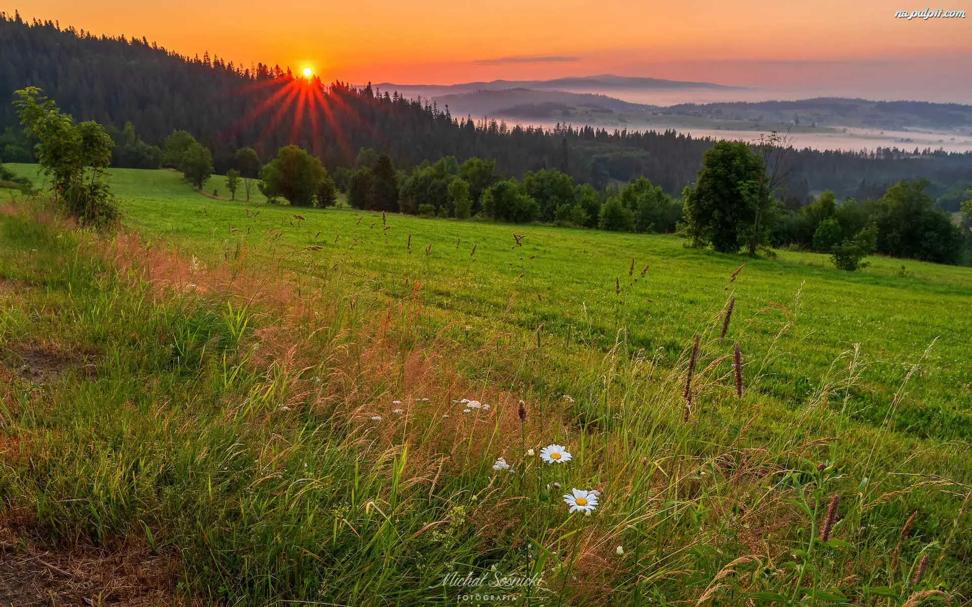 Kwiaty, Drzewa, Łąka, Wschód słońca, Góry