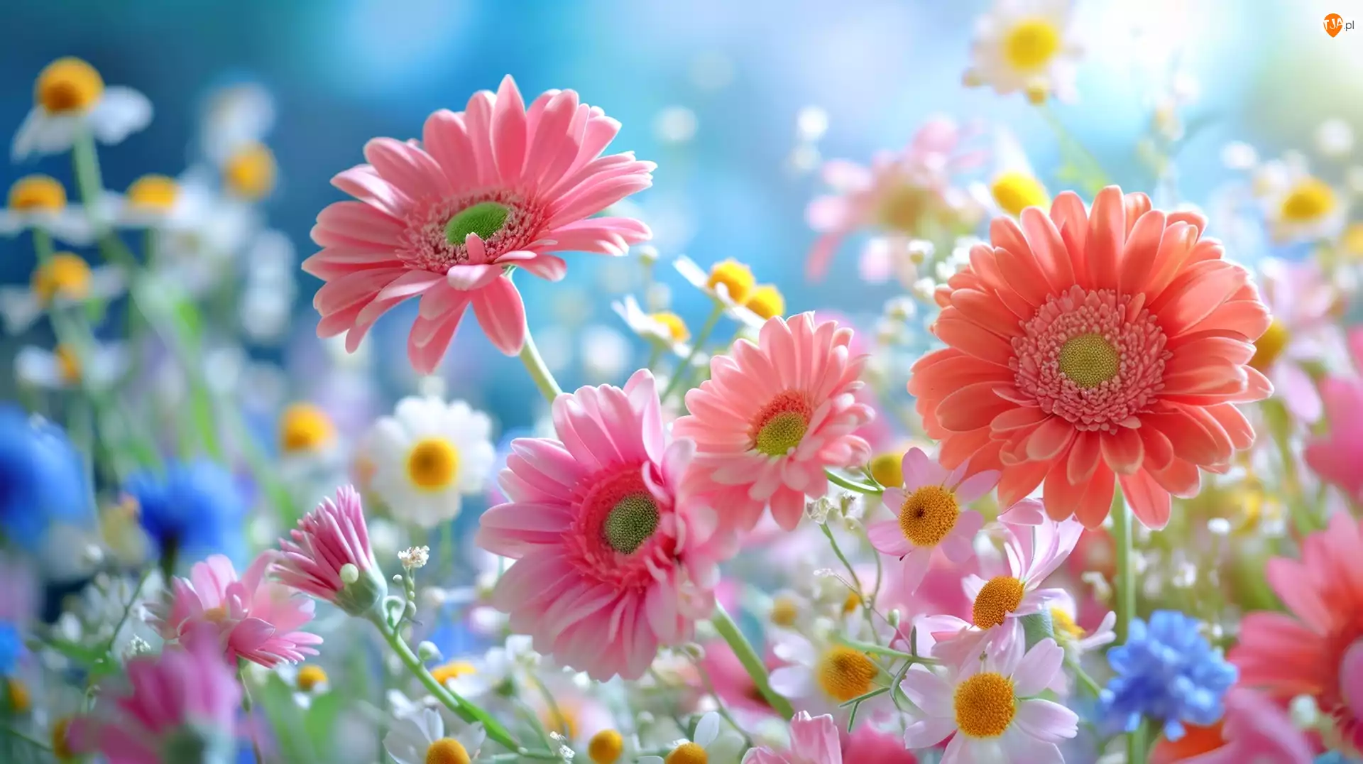 Kwiaty, Gerbery, Błękitne, Grafika, Różowe, T