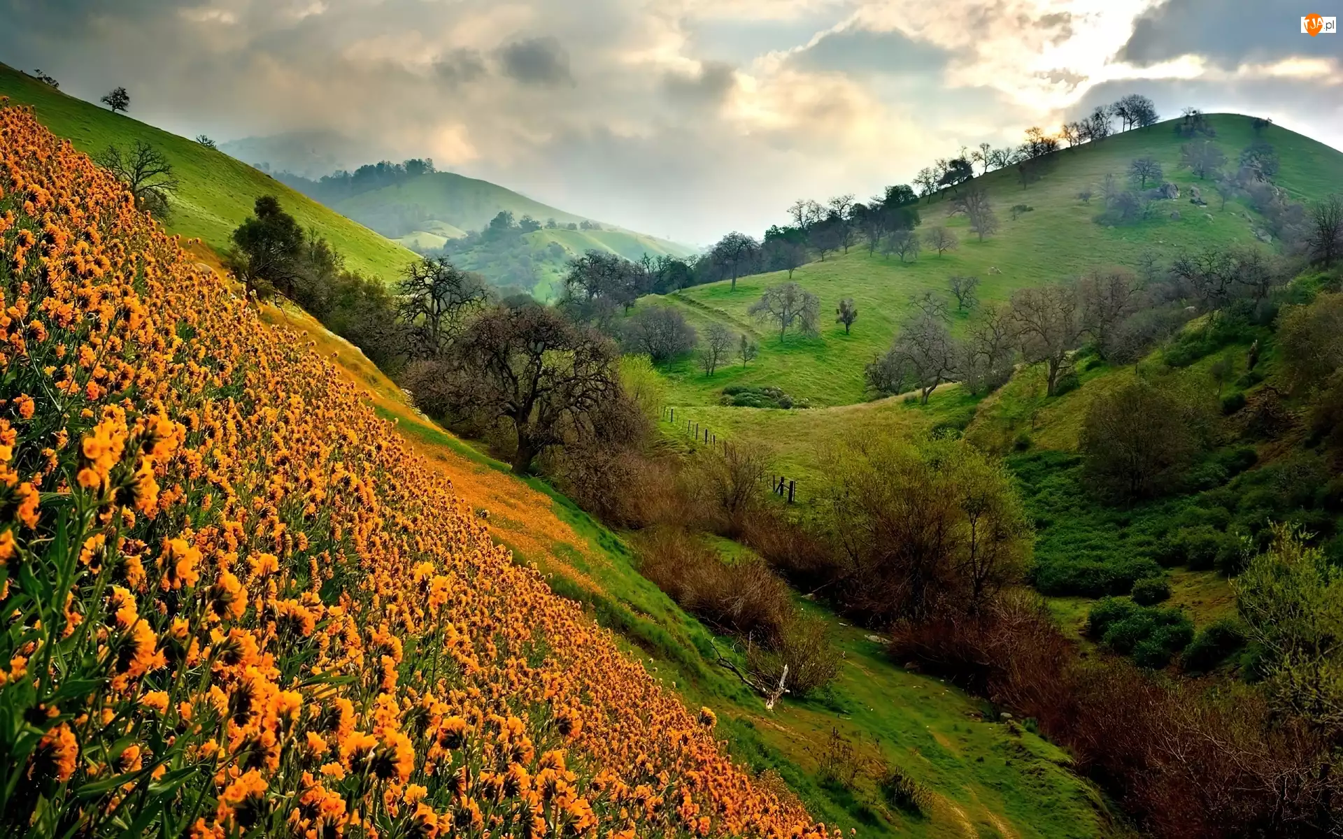 Niebo, Kwiaty, Zachmurzone, Góry, Stok