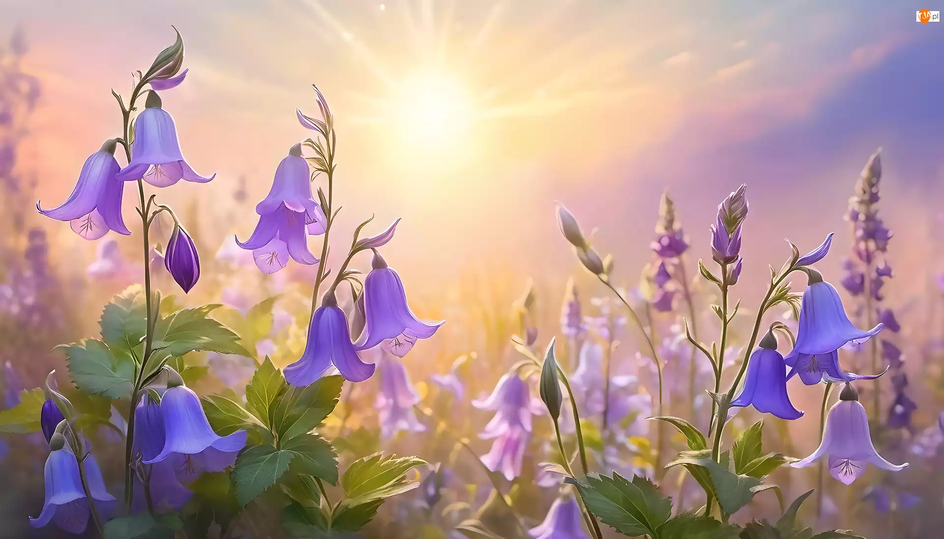 Kwiaty, Grafika, Dzwonki, Fioletowe, Słońce