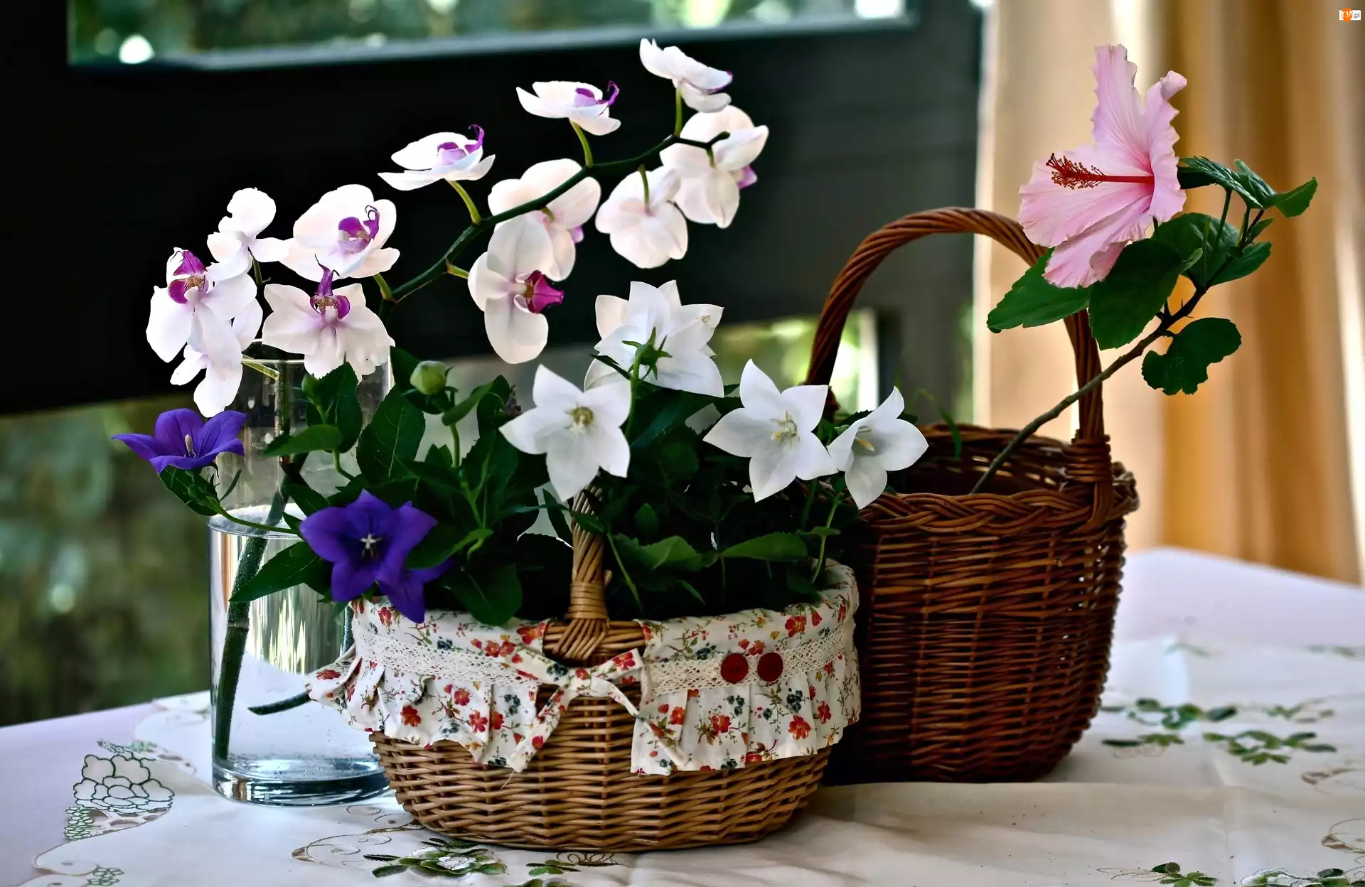Kwiaty, Hibiskus, Kompozycja, Orchidea, Kosze, Dzwonki