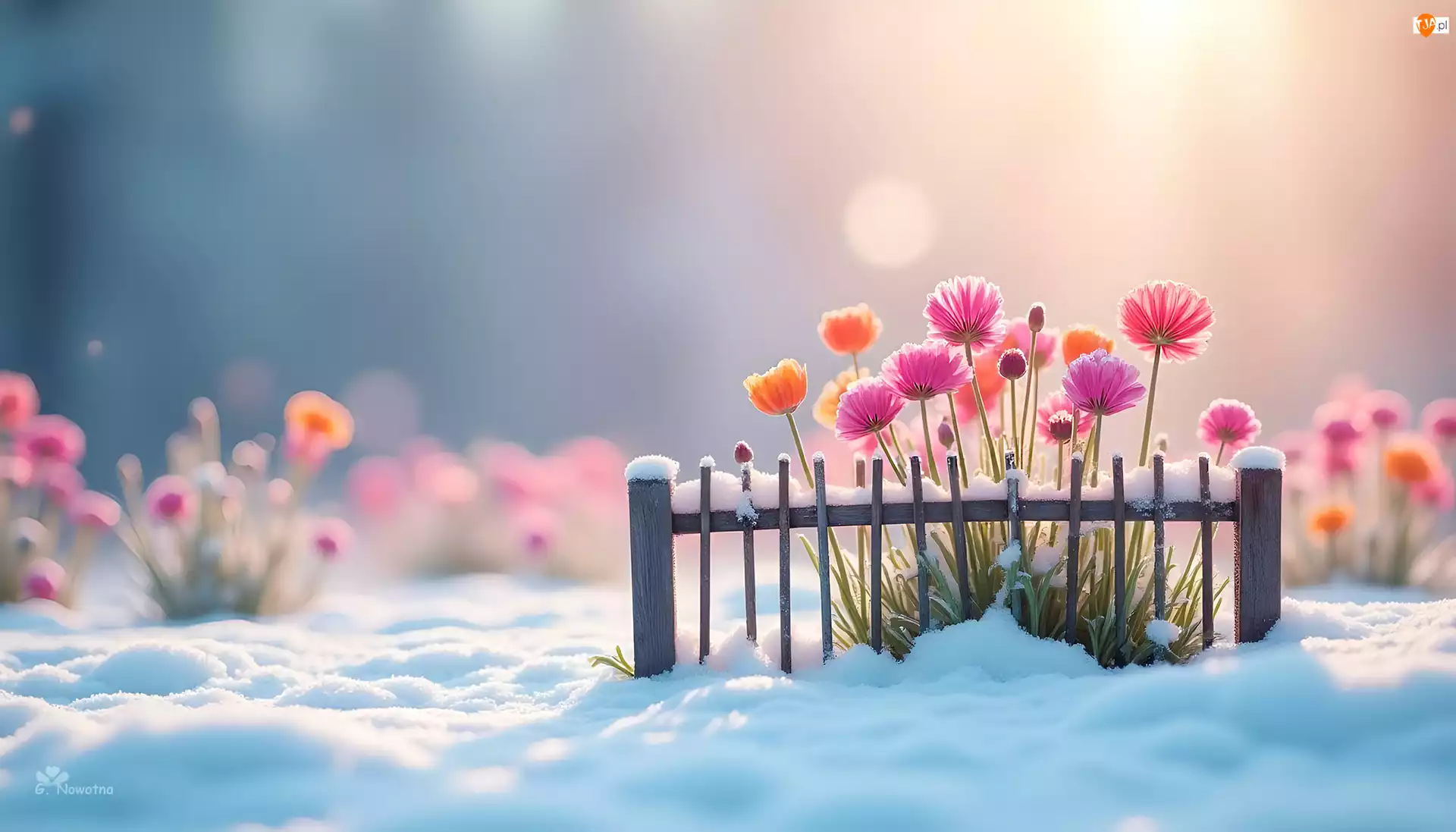 Kwiaty, Kolorowe, Śnieg, Grafika, Płotek, Zima