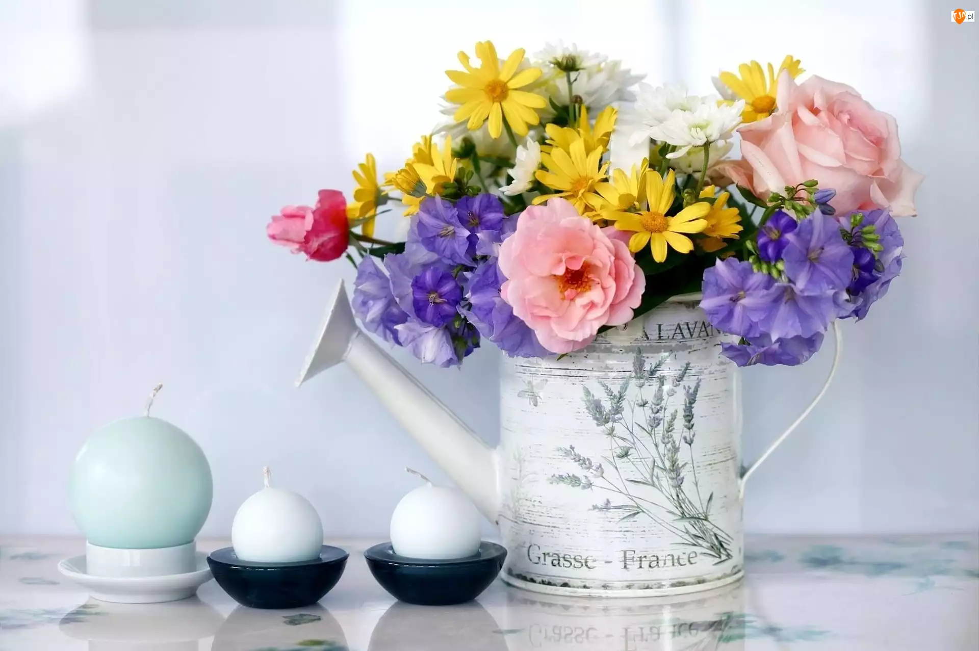Kwiaty, Kompozycja, Konewka, Świeczki